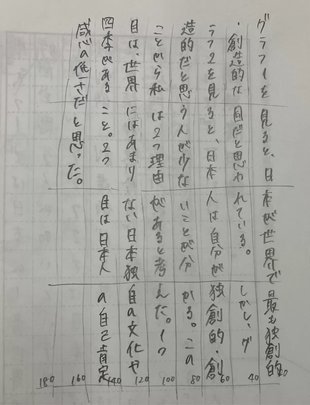 問題の趣旨としては、2つのグラフを総合的に考えた上で、あなたの考えを述べないといけないと思います。後半の意見はグラフ2のことしか言ってないのが気になります。この2つのグラフからわかることは、「日本は世界から独創的な国であると思われているのにも関わらず、国民はそう感じていない」ということでしょう。