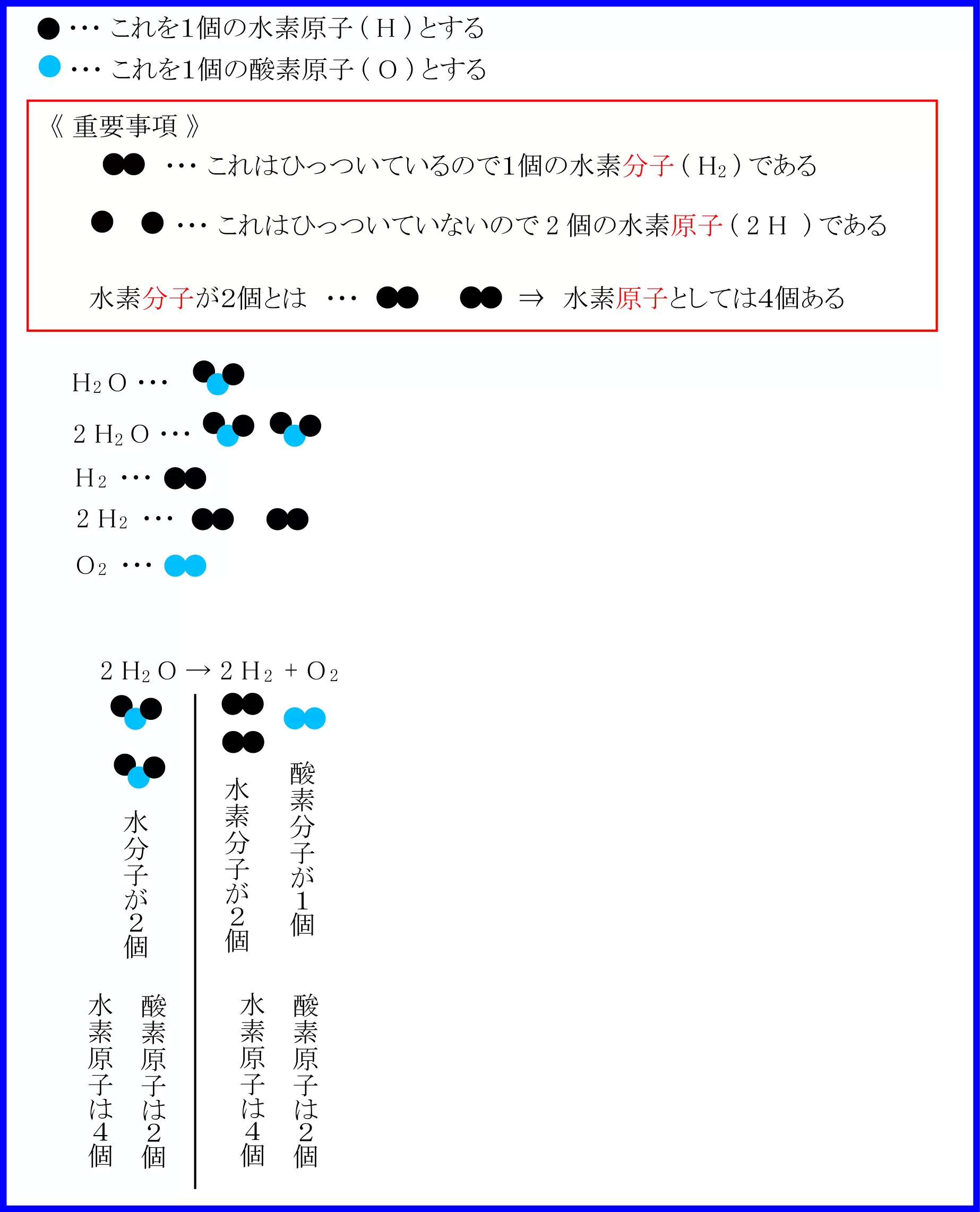 ア 化学反応式の左辺 (式の左側) にある2H2O は,水素原子4個と酸素原子2個が結