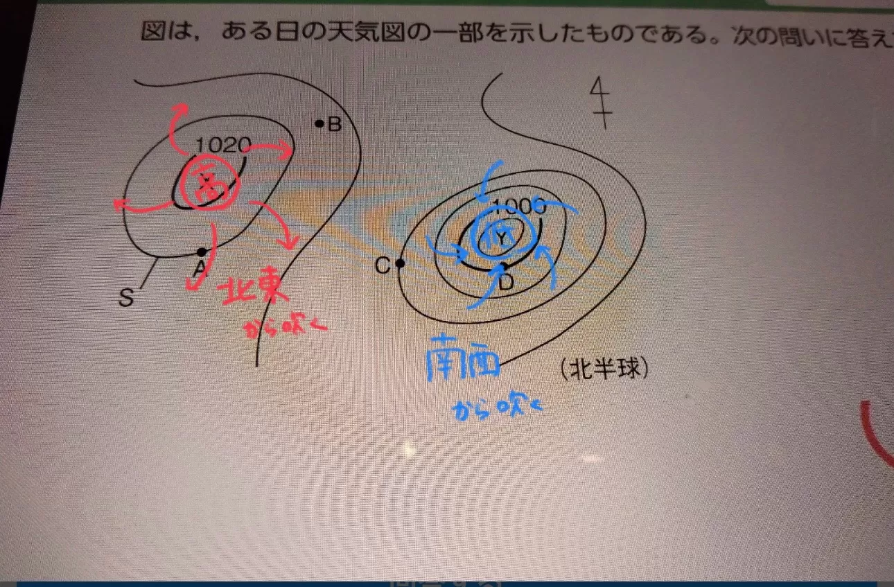 低気圧は空気が上昇して、頭の上の空気が持ち上げられている状態。(気圧とは頭の上の空気の重さなので、持ち上げてもらったら軽くなりますよね。)このとき、空気は天から見て反時計回りに回転します。台風と同じ。